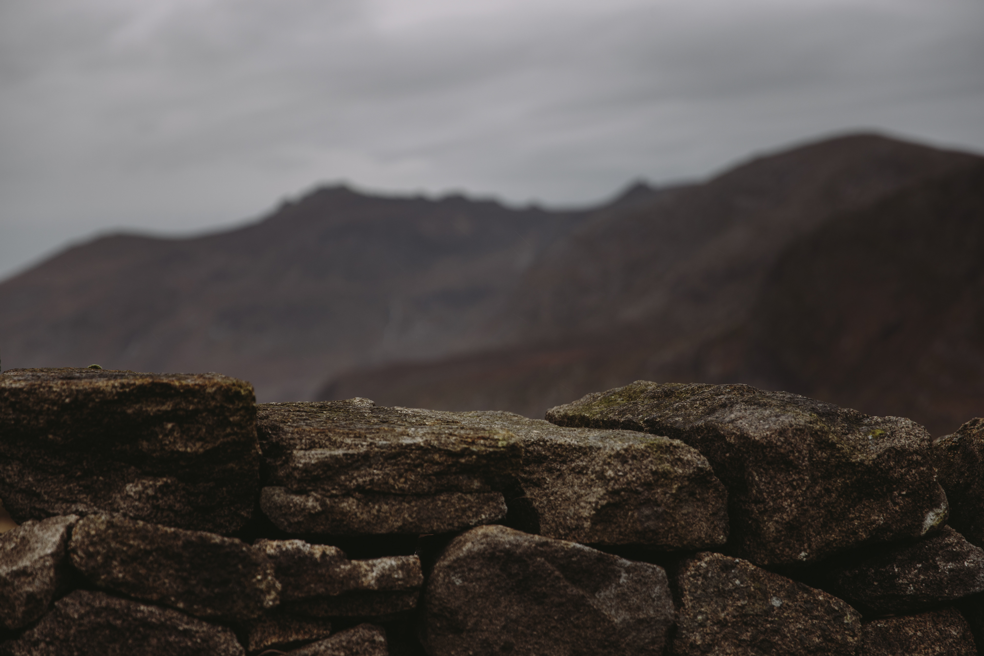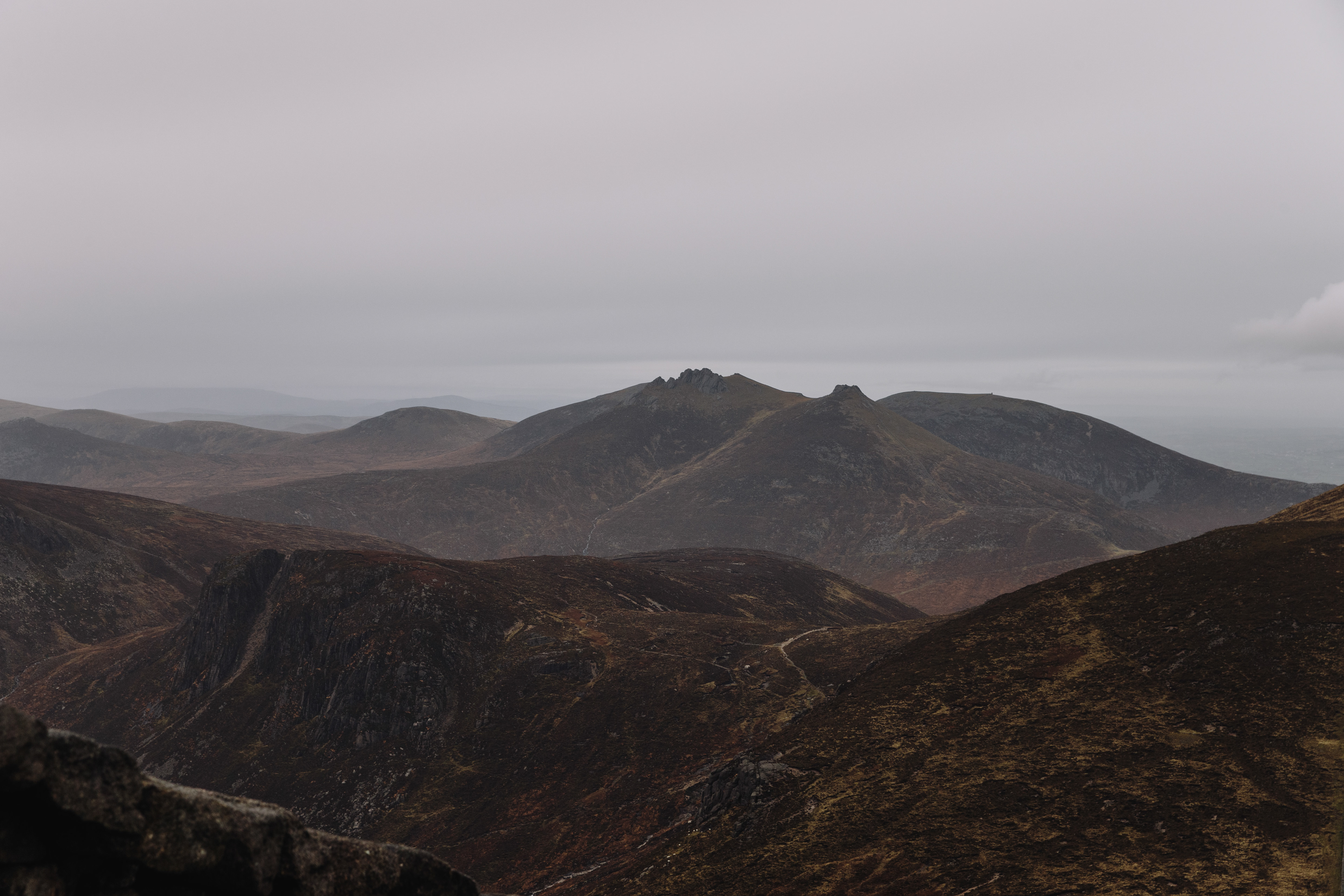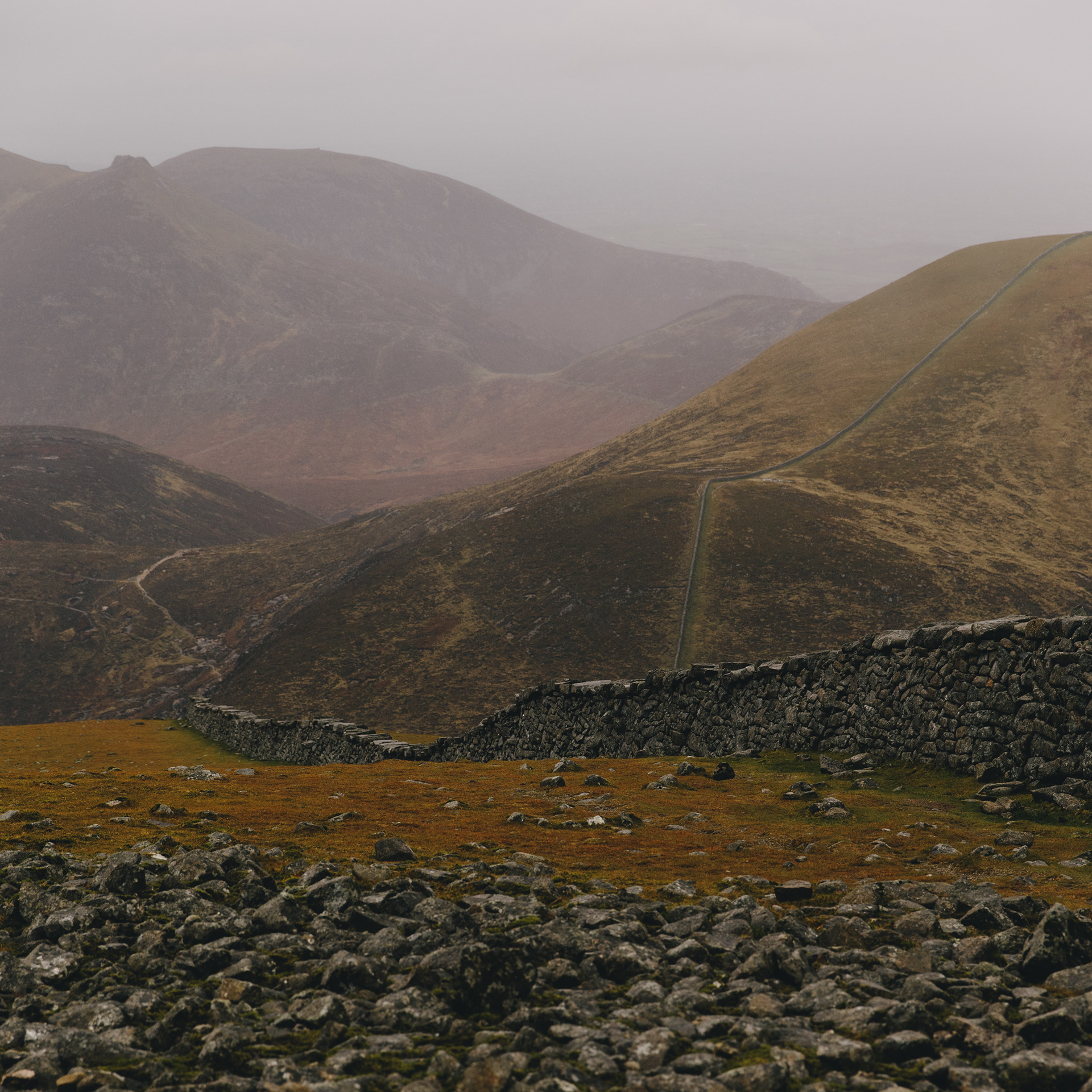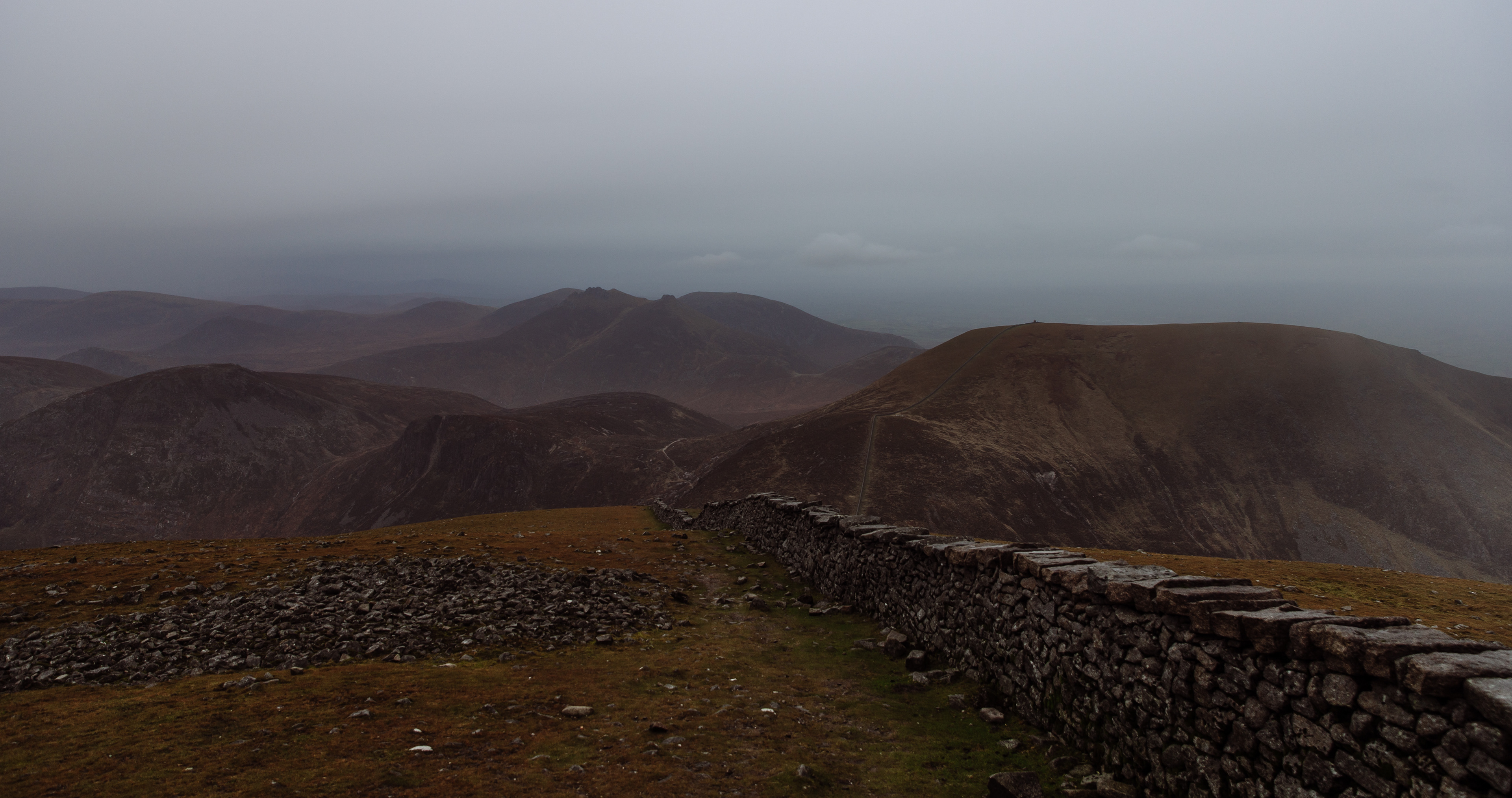 The Mourne Mountains and the Mourne Wall, from the summit of Slieve Donard in the rain, November 2014.